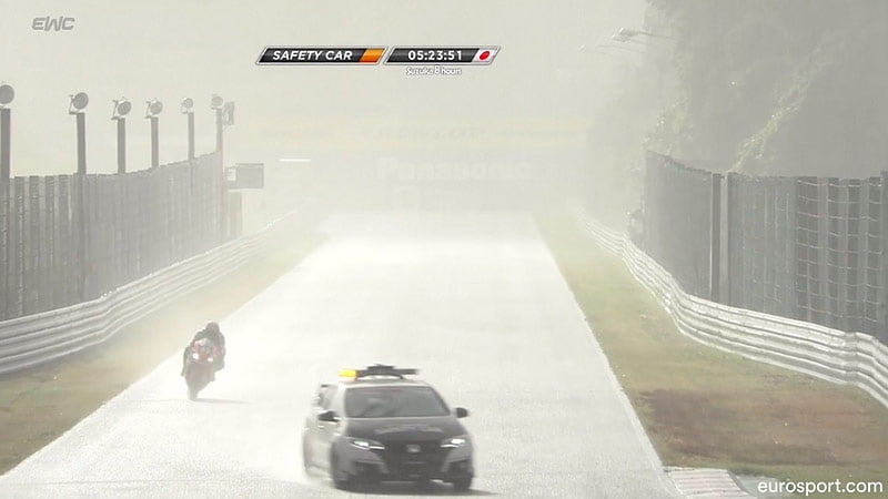 Quoi qu’il en soit, la numéro 11 décroche peu à peu aux mains de Leon Haslam et possède une quarantaine de secondes de retard quand, après 4h45 de course, les drapeaux annonçant l’arrivée de la pluie sont agités.