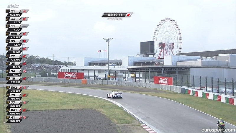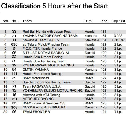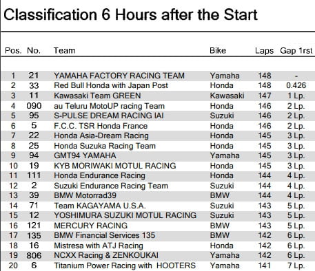 La Honda #33, qui avait pris la tête à la faveur du ravitaillement de la Yamaha #21, voir ainsi son avantage réduit à néant, alors qu’à l’inverse, la Kawasaki #11 se voit reléguée avec la 2e voiture de sécurité, à plus d’une minute des 2 premiers : il s’agit peut-être là d’un des tournants de la course…