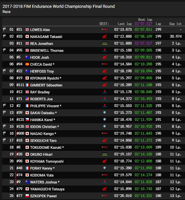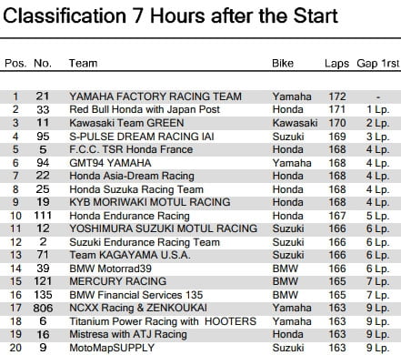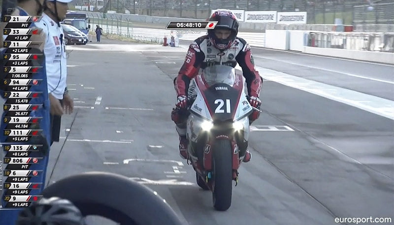 La Yamaha Factory effectue son dernier ravitaillement et Alex Lowes en prend les commandes. Elle repart avec 25 secondes d’avance sur la Red Bull Honda with Japan Post, ce qui l’a met définitivement hors de portée des troupes de Tokyo malgré une dernière heure sans arrêt au stand pour la Honda #33.