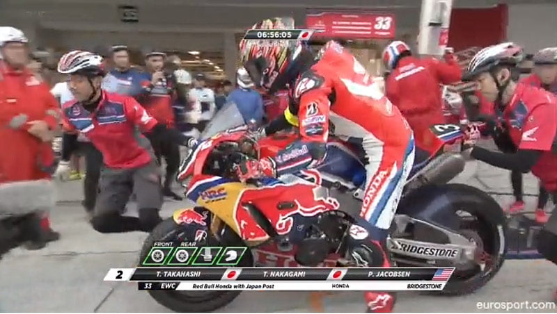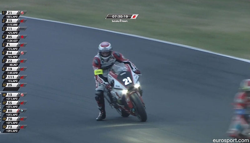 La Honda #90 du au Teluru MotoUP racing Team par malheureusement à la faute alors qu’elle occupait la 4e position avec Kosuke Akiyoshi, Tetsuta Nagashima et Isaac Vinales. Elle nécessite des réparations et, du coup, la FCC TSR #5 s’empare de la 5e position, 3 places devant la GMT 94 Yamaha, moto toujours en lutte pour le titre mondial.