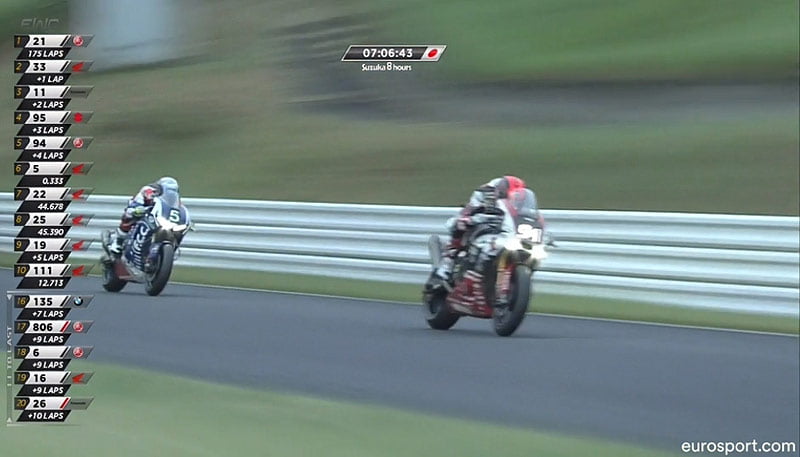 Juste après 7 heures de course, Leon Haslam parvient provisoirement à dédoubler la Kawasaki par rapport à la Honda et figure maintenant à nouveau dans le même tour que celui-ci. Il reste une heure de course…