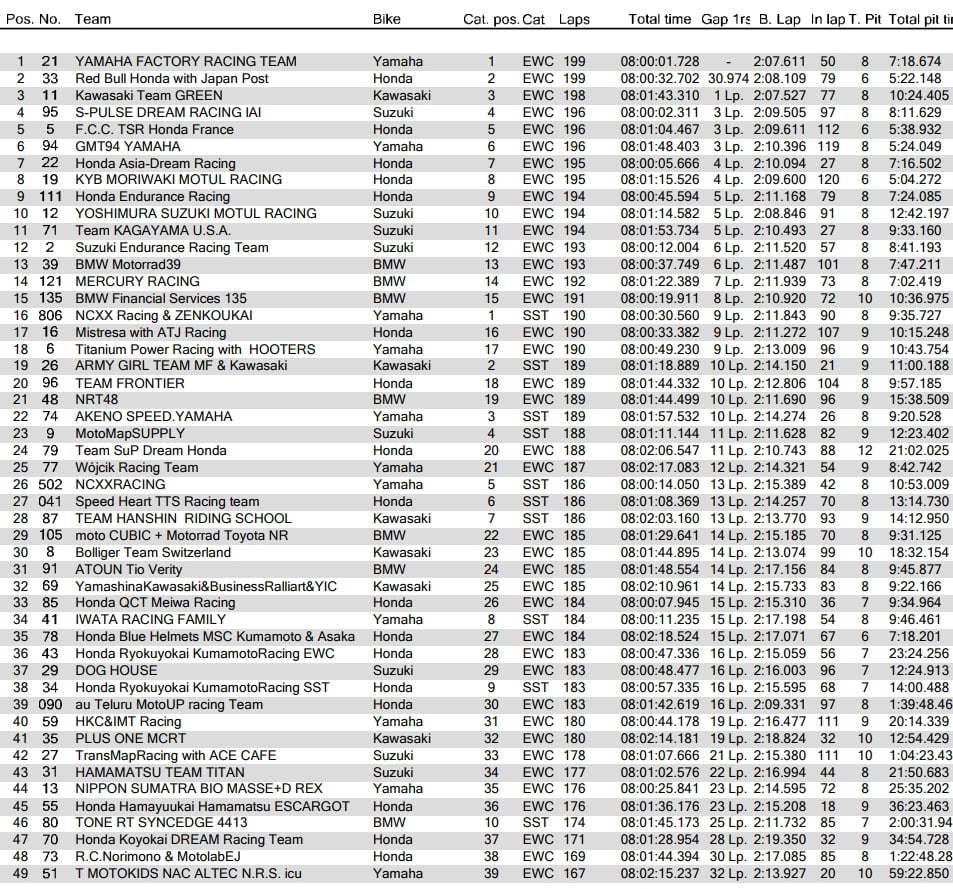 Sans (mauvaise) surprise de dernière minute, Yamaha inscrit au terme de 199 tours à Suzuka sa 4e victoire consécutive après n’avoir commis aucune erreur, et donc vaincu à la régulière non seulement Honda, mais aussi Kawasaki et Suzuki.