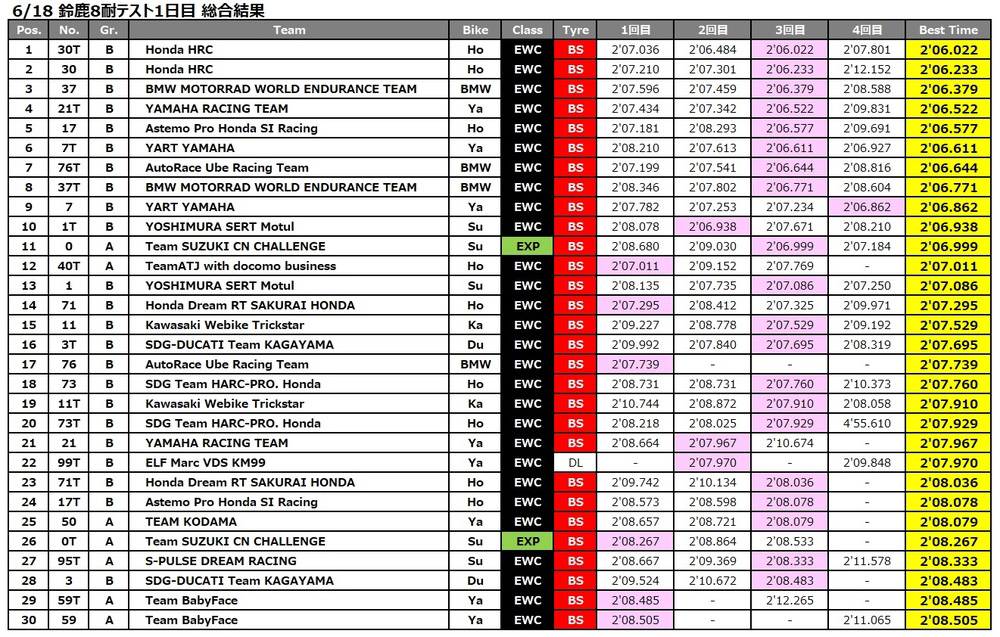 Dans la séance suivante, la Honda officielle a maintenu son avantage en descendant en 2’06.484, une demi-seconde devant la Suzuki #1, la YART Yamaha, la Yamaha officielle, la BMW officielle et toujours cette surprenante BMW #76 !