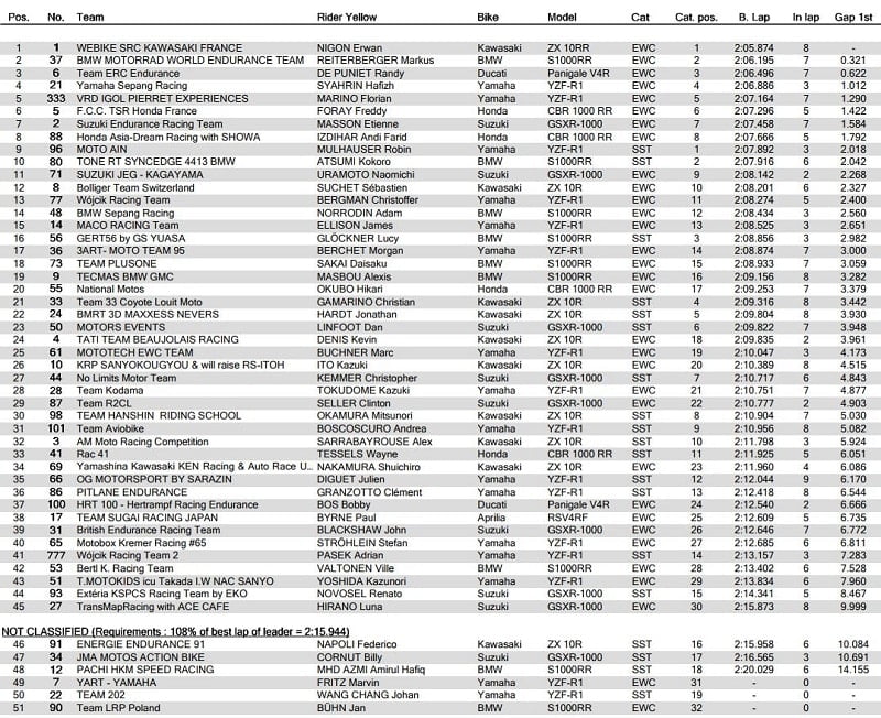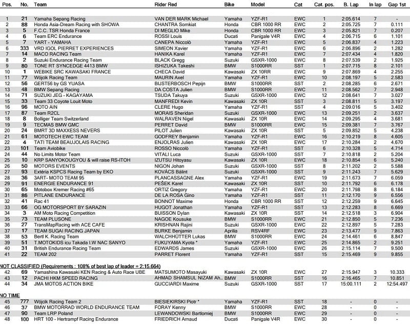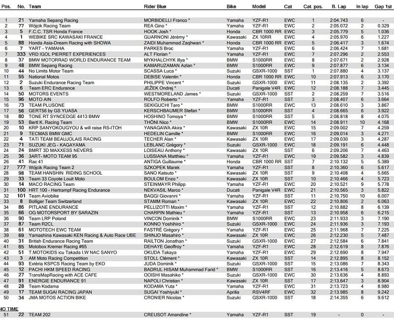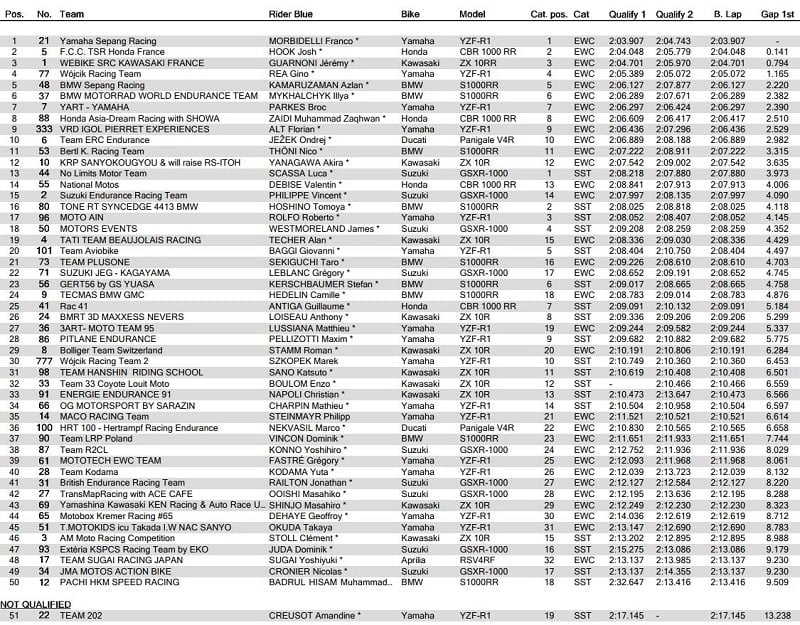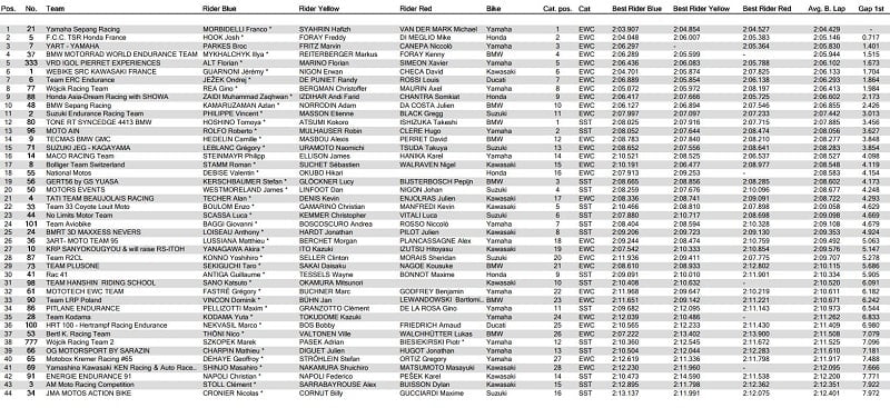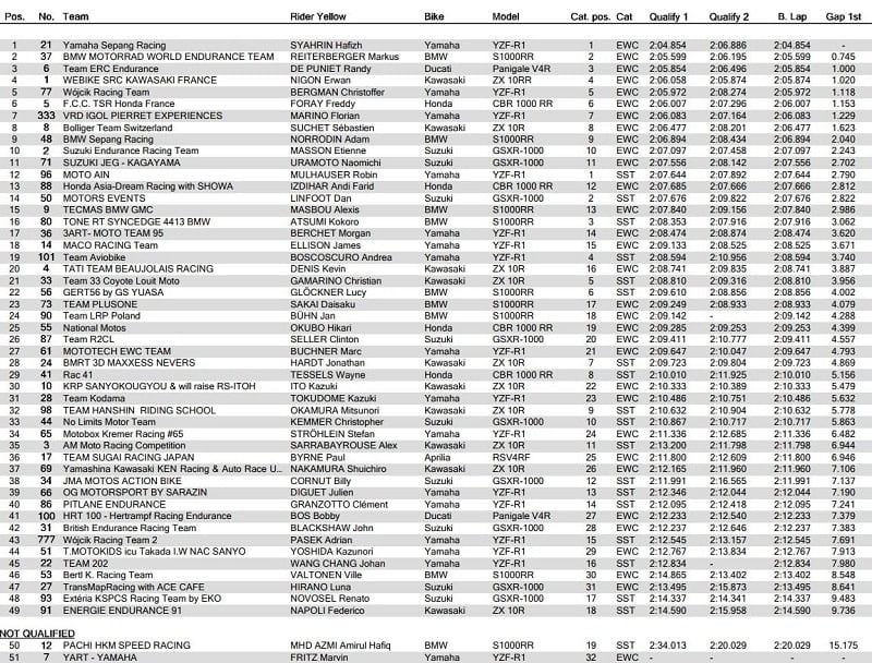 La Yamaha R1 engagée par le Circuit de Sepang a fait merveille lors des qualifications, comme elle l’avait fait dans le passé aux 8 Heures de Suzuka. Plusieurs machines sont capables de lui porter la contradiction, mais tous les équipages ne sont pas forcément aussi performants et homogènes. Le YART, déjà malheureux au Bol d’Or, a perdu Marvin Fritz qui s’est fracturé une clavicule lors d’une chute.