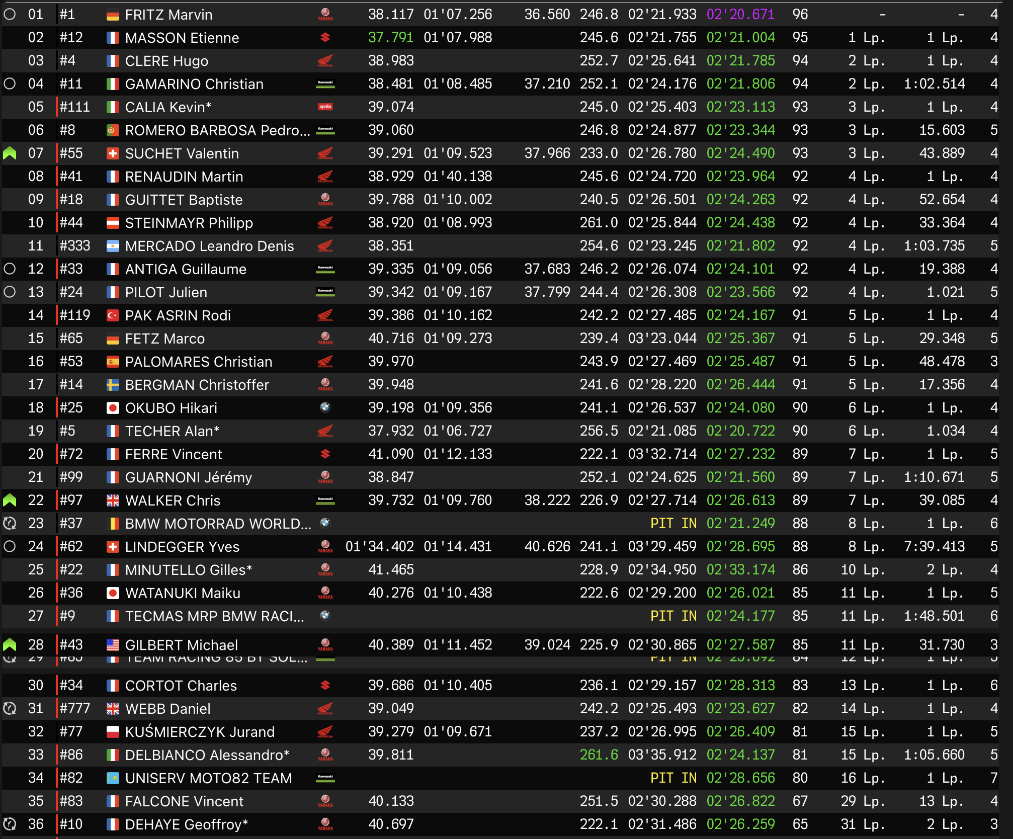 La n°111, emmenée par Kevin Calia prend la course en main, et mène actuellement la danse dans la catégorie avec une poignée de secondes d’avance sur Valentin Suchet (National Motos Honda.) Les deux machines évoluent en 5e et 7e position au classement général.
