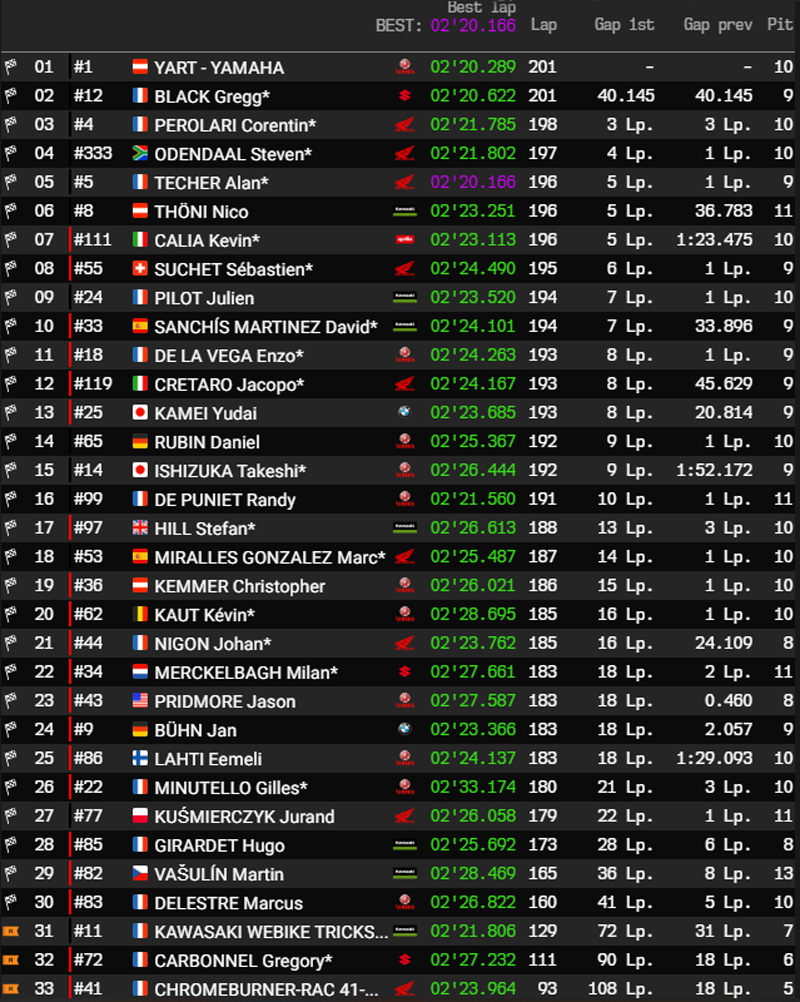 Une place et un tour plus loin, on trouve la machine sœur #333 de l’équipe Honda Viltaïs Racing emmenée par Florian Alt / Steven Odendaal / Leandro Mercado, alors que la Honda CBR 1000 RR-R #5 du F.C.C. TSR Honda France termine finalement 5e à 5 tours, avec de très beaux relais d’Alan Techer après la chute de Josh Hook dans le deuxième secteur.