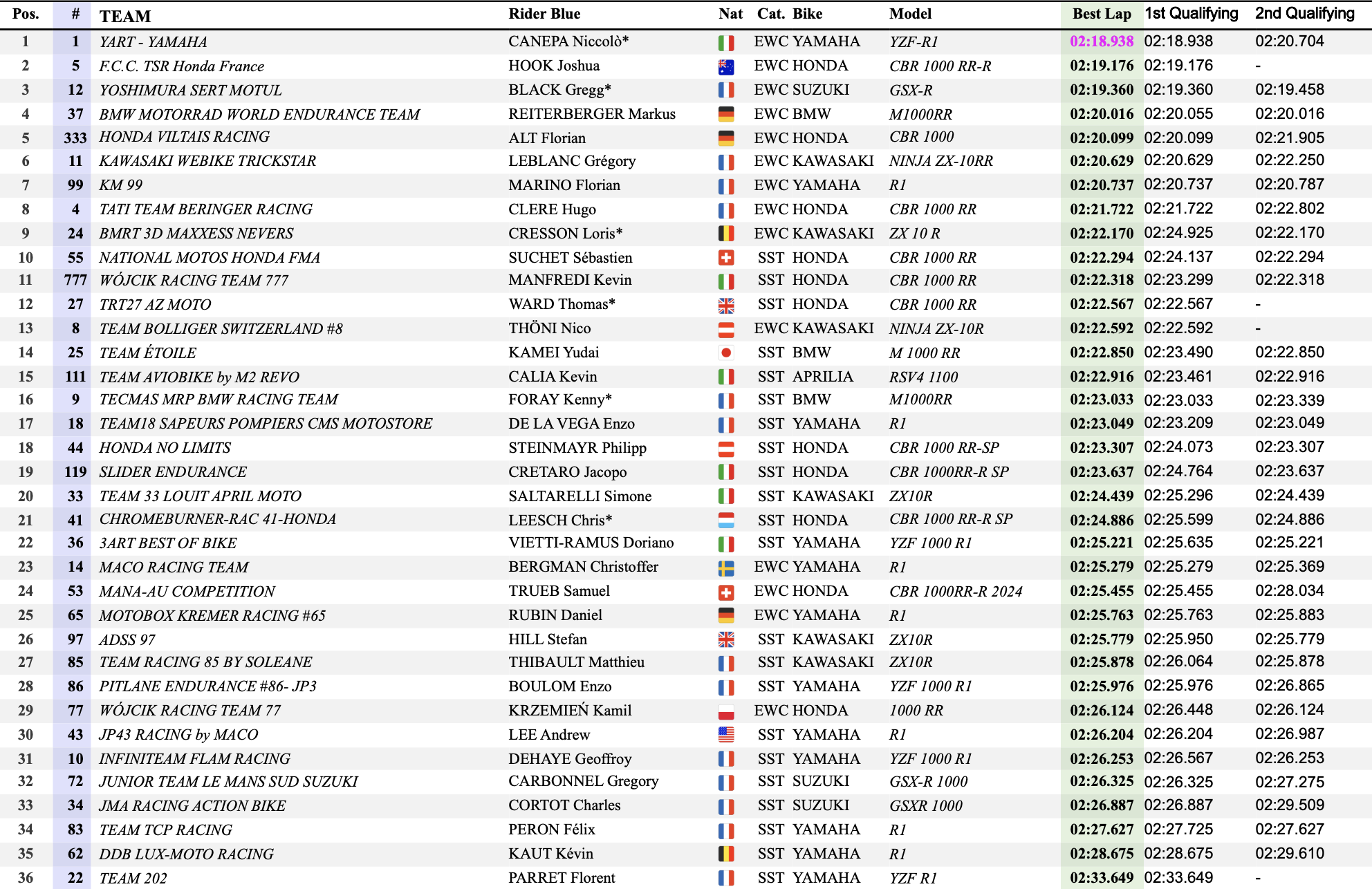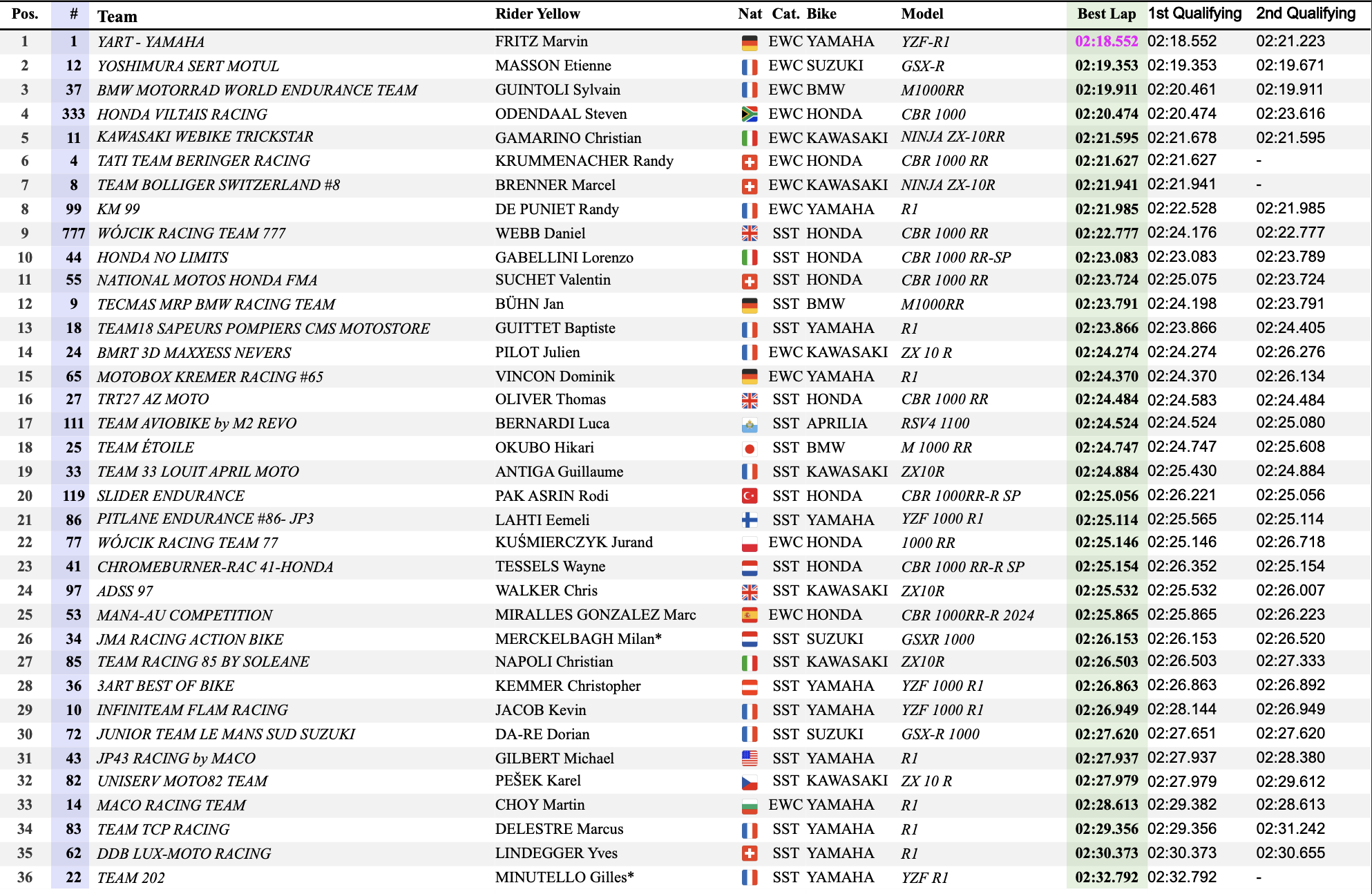 Après avoir largement dominé le début de week-end des 8H de Spa, Yart Yamaha s’offre naturellement la pole position pour la course de demain. Portée par les exploits de Marvin Fritz la formation autrichienne a inscrit un nouveau record du tour en Qualifications, après avoir battu le record du tour en essais libres.