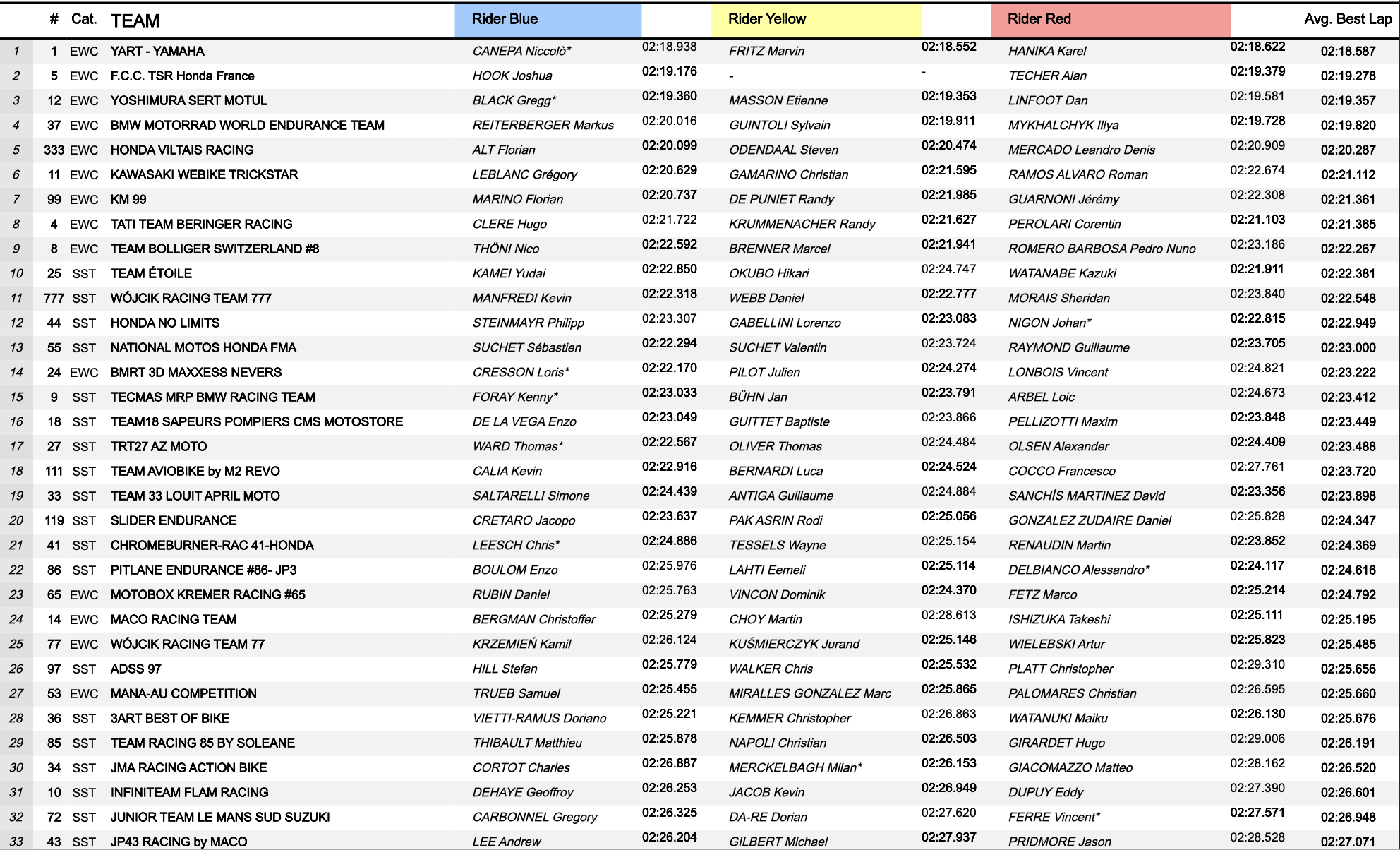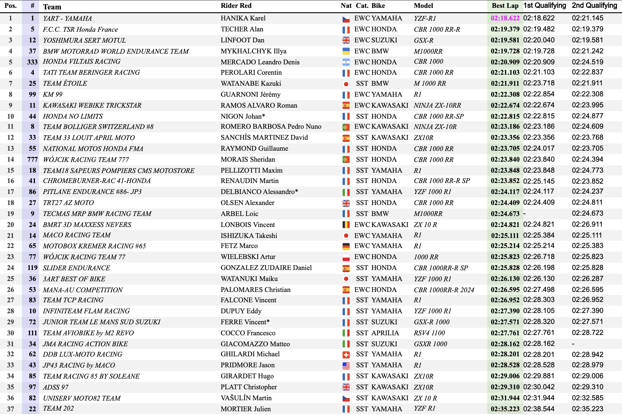 Les hommes de la n°44 prendront le départ de la course depuis le douzième rang de la grille, tandis que la n°777 est venue s’intercaler entre les deux équipages. Le team National Motos Honda complète ce groupe de quatre machines avec le treizième temps au général. Tout peut donc encore changer dans les premières minutes de l’épreuve entre ces différents protagonistes.
