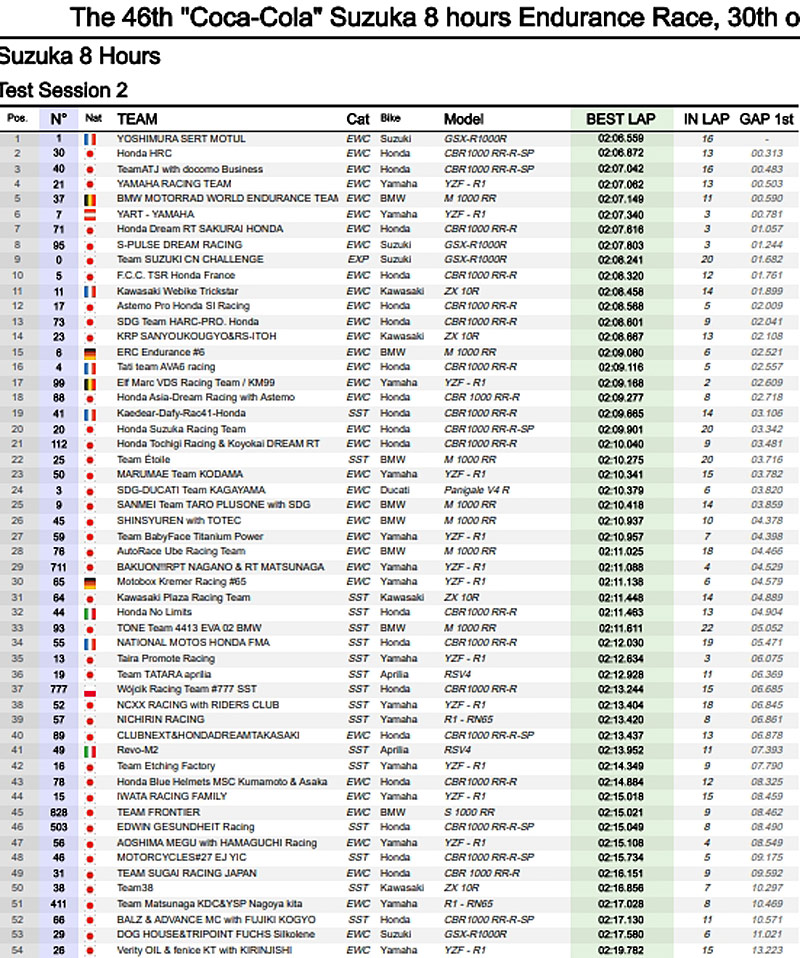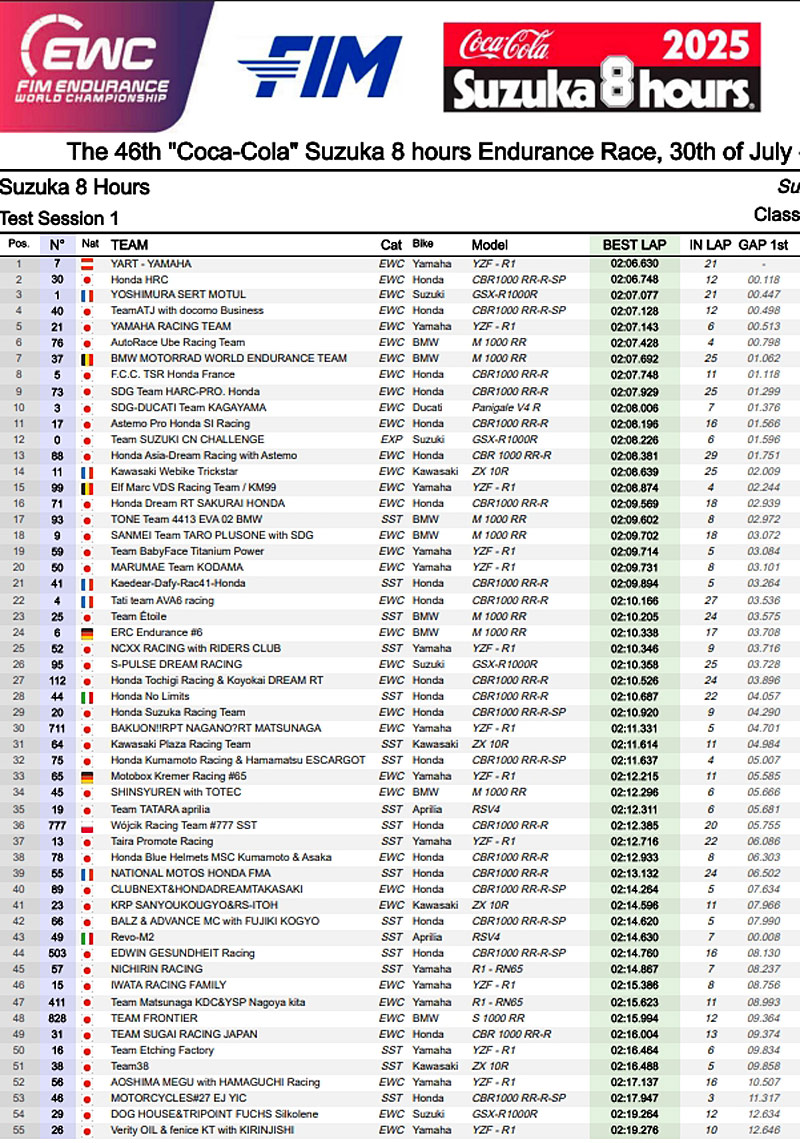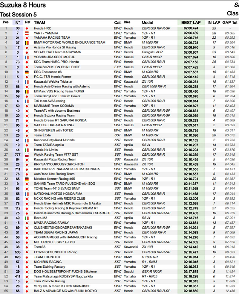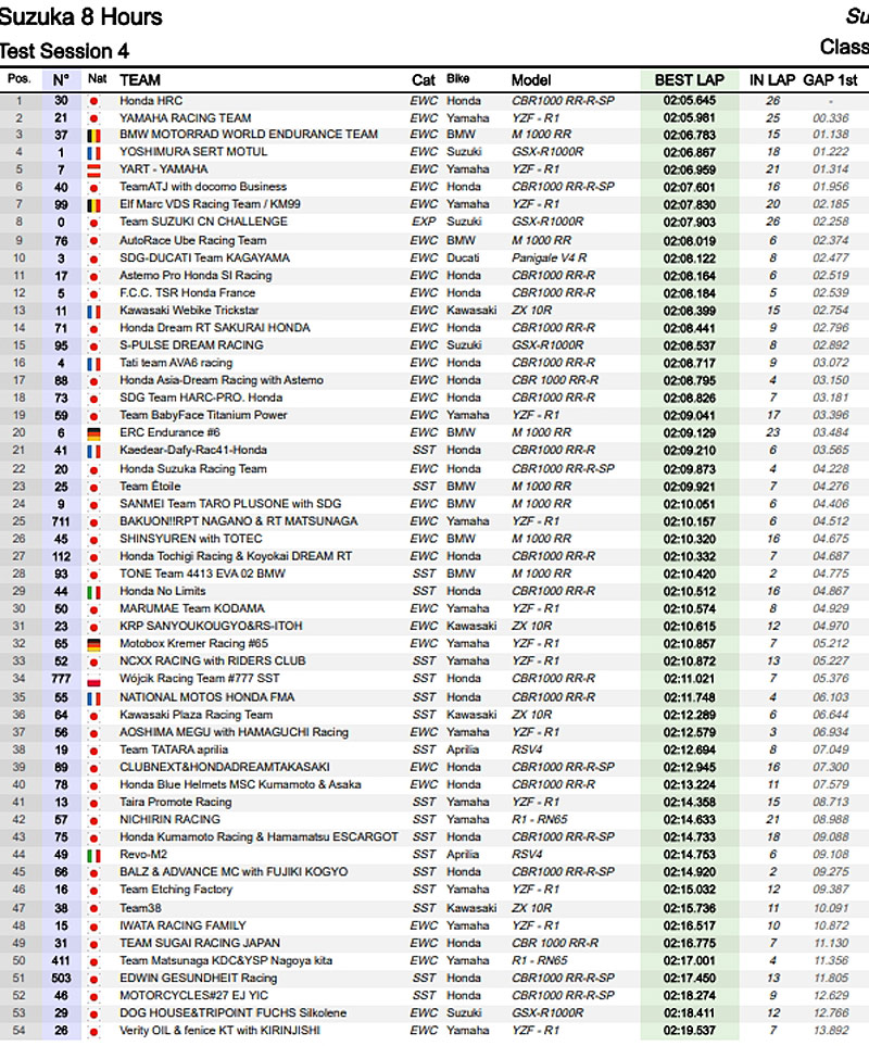 La Yoshimura SERT Motul #1, la Honda #40 du team local ATJ with Docomo Business, la Yamaha Racing Team #21 et la BMW Auto Race Ube #76 complétaient alors le tableau dans la même seconde.