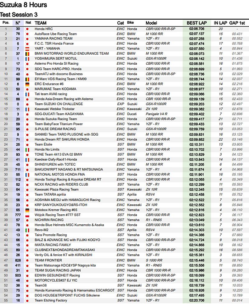 Seulement deux drapeaux rouges et seulement une moto en 2’06 dans la troisième séance, mais le top 5 voit l’arrivée de la rapide BMW japonaise #76 de Loris Baz, et la FCC TSR Honda France #5 bien connue chez nous.