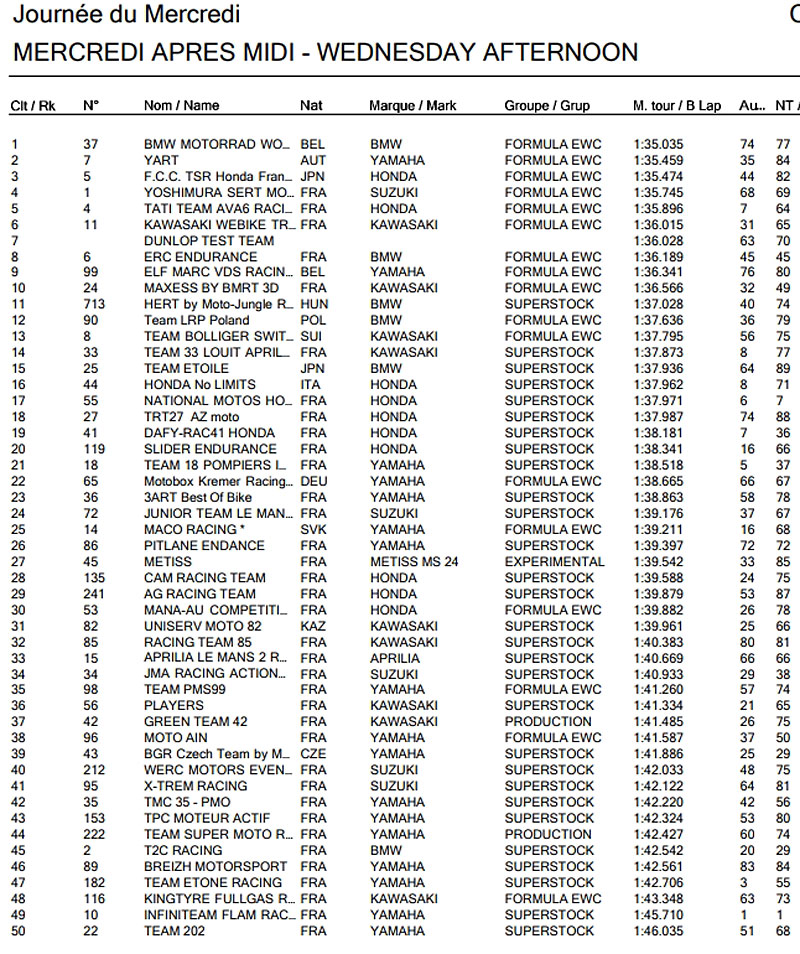 Son meilleur temps de 1m35.035s, réalisé lors de la séance de l’après-midi, fraîche mais ensoleillée, se compare favorablement à l’effort de référence de Yoshimura SERT Motul de mardi, 1m36.125s. Il se situe également en-dessous du record du tour de l’équipe officielle Yamalube YART Yamaha EWC de 1m35.791s, qui a été enregistré par Niccolò Canepa en avril dernier.