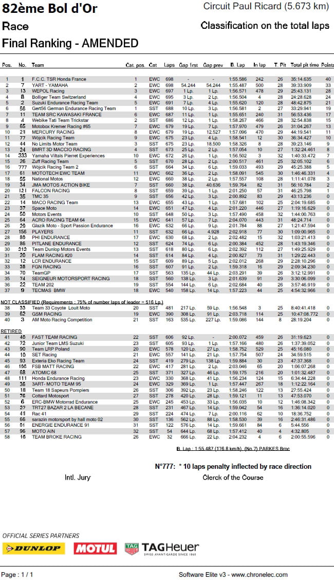 Le Champion du monde FIM EWC fait honneur à son titre et débute une nouvelle saison par une victoire au Bol d’Or. Sur le circuit Paul Ricard, Freddy Foray, Josh Hook et Mike Di Meglio pour F.C.C. TSR Honda France arrachent la victoire sur le YART Yamaha de Broc Parkes, Niccolò Canepa et Marvin Fritz. 54 secondes seulement séparent cette Honda japonaise et la Yamaha autrichienne parties respectivement en 2e et 3e place sur la grille.