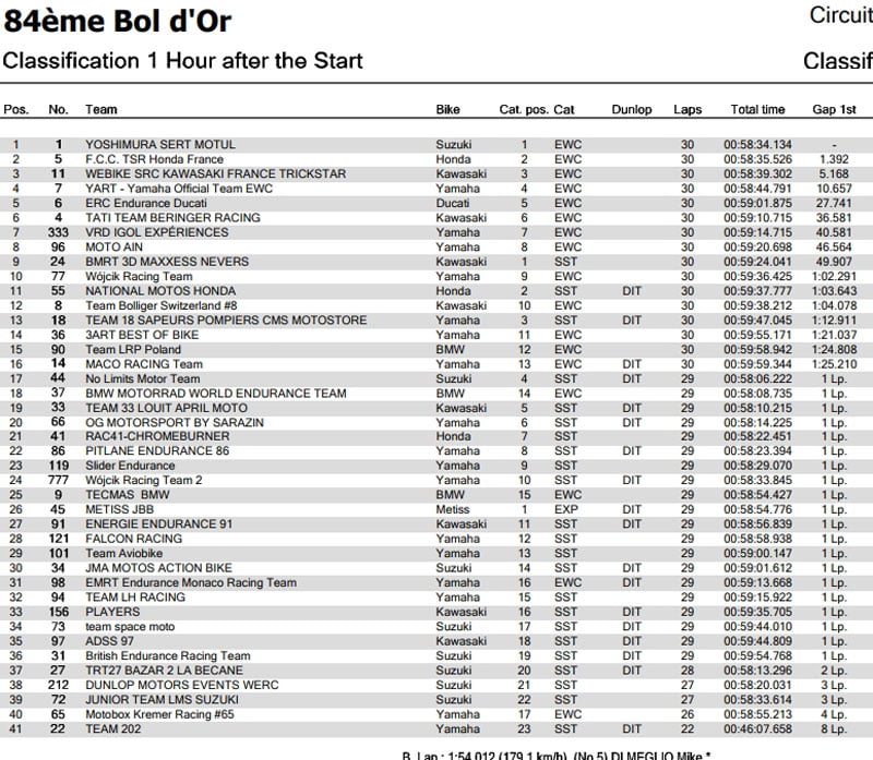 La Kawasaki ZX 10R #11 est la première à passer par la voie des stands, à la fin du 22e tour, bientôt suivie par la Honda CB R1000 RR-R #5. Jérémy Guarnoni, laissant sa place à Erwan Nigon, se confie sur son impressionnant début de course : « On a de très bonnes sensations. Hier j’ai raté ma qualification, mais avec le plein d’essence la Kawasaki est très bien équilibrée. J’ai même pu passer en tête mais avec l’aspiration il est difficile de creuser l’écart. Je pense que nous pouvons jouer la victoire. »