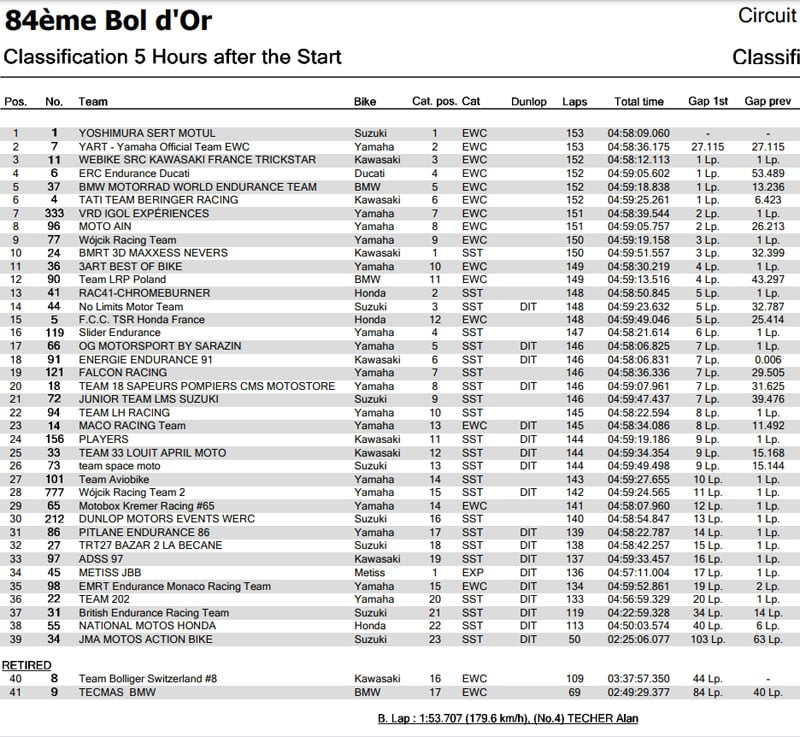 BMW Motorrad World Endurance Team souffrait de vibrations en début de course, ce qui contraint l’équipe à un arrêt prématuré. La M1000RR #37 poursuit donc sa lente remontée grâce à un Kenny Foray en jambe. Alan Techer, pourtant blessé, parvient à améliorer le record du tour (1’23’’707) pour Tati Team Beringer Racing, en sixième position.