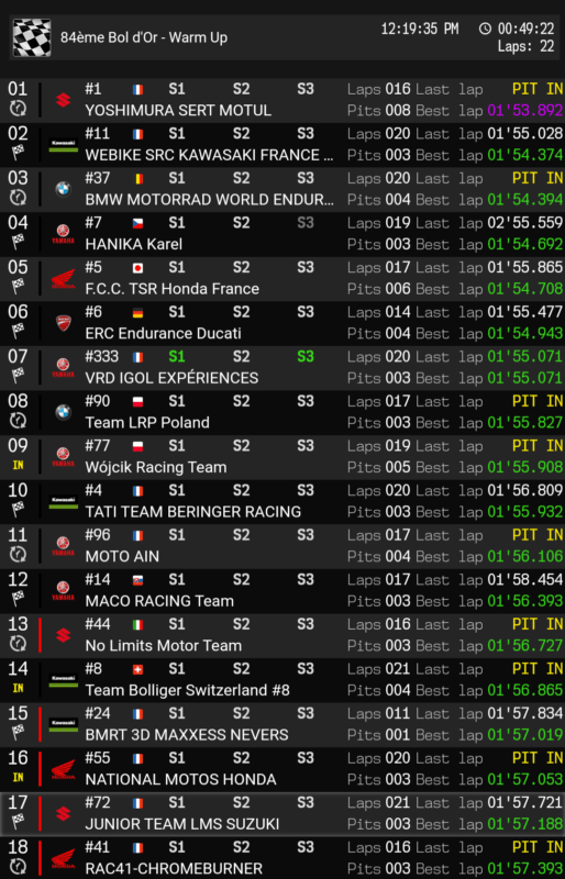 Si la course est indécise, l’équipage Suzuki de pointe semble avoir l’avantage sur tous les concurrents et s’affirme, par le biais de ce warm-up, principal favori de l’épreuve. La fiabilité sur 24 Heures n’est plus à prouver et la vitesse de Xavier Siméon, homme du week-end – nouveau détenteur du record de piste – pourrait bien poser des problèmes à la concurrence. Notons que la Yamaha YZF-R1 #18 des Sapeurs-Pompiers, en pole position dans sa catégorie, est finalement assez éloignée de la tête.