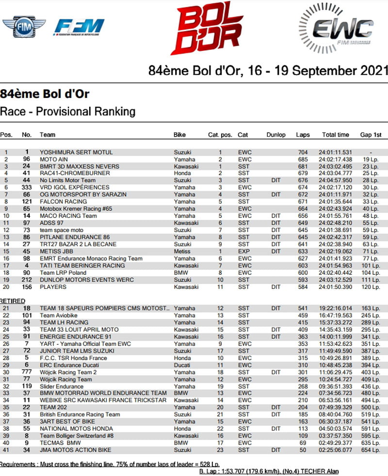 La Metiss MS20 EVO 21 #48, seule engagée dans la catégorie expérimentale, termine le Bol en 15e position. Logiquement, Yoshimura SERT Motul prend les commandes du championnat du monde. Deuxième victoire consécutive pour BMRT 3D Maxxess Nevers qui remporte le titre de champion du monde Superstock.