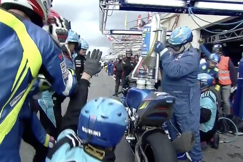 Le YART (Loris Baz, Marvin Fritz et Niccolò Canepa) et Webike SRC Kawasaki France (Jérémy Guarnoni, Erwan Nigon et David Checa) étaient définitivement éliminés par l’incendie alors que FCC TSR Honda France (Josh Hook, Freddy Foray et Mike Di Meglio) tentait de réparer pour essayer de repartir.