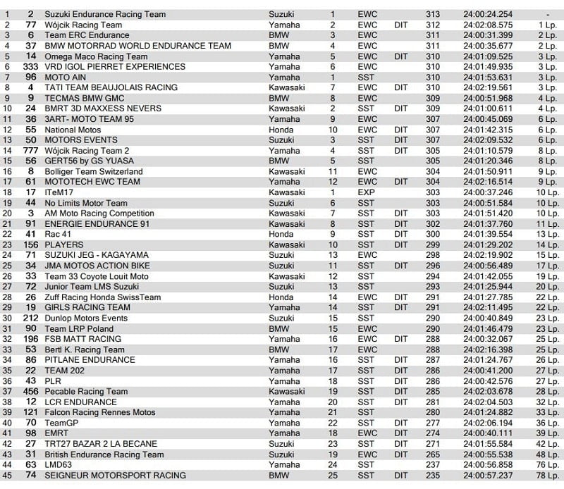 Le Suzuki Endurance Racing Team (Vincent Philippe, Étienne Masson et Gregg Black) l’emportait finalement devant le Wojcik Racing Team (Gino Rea, Christoffer Bergman et Axel Maurin), ERC Endurance (Mathieu Gines, Julien da Costa et Louis Rossi) et BMW Motorrad World Endurance Team (Ilya Mikhalchik, Julian Puffe et Kenny Foray).