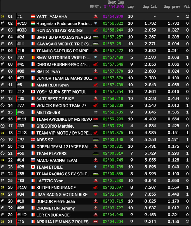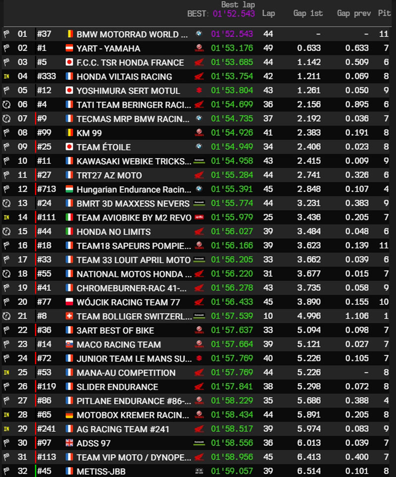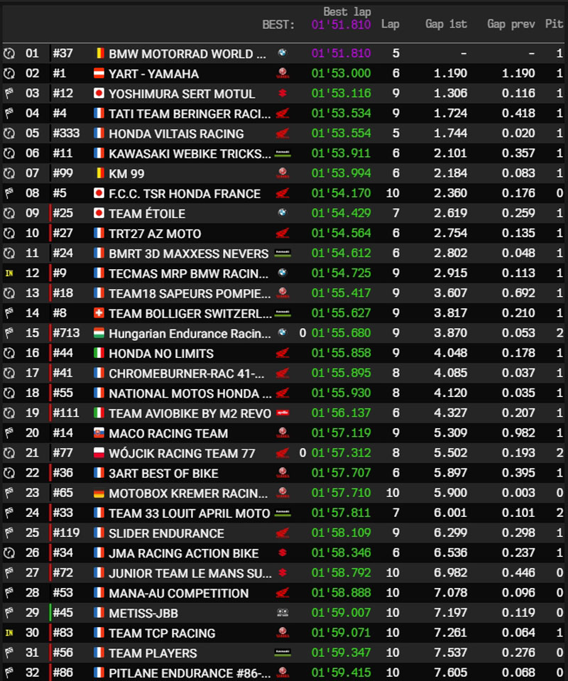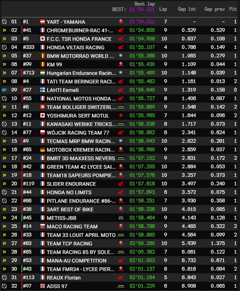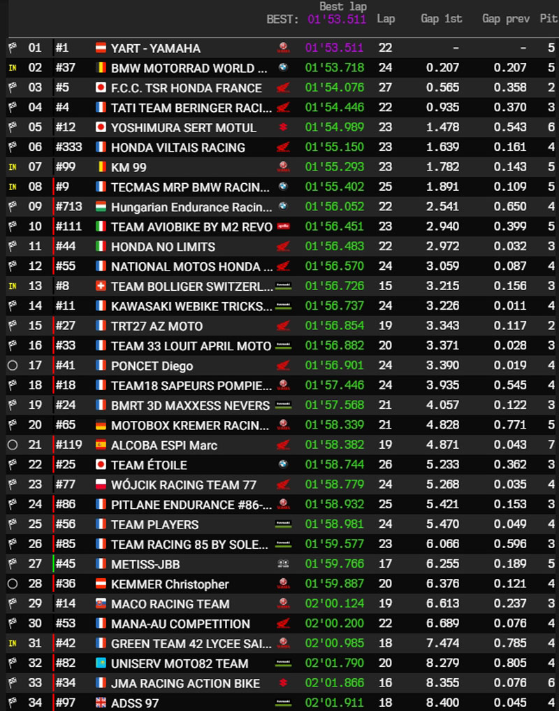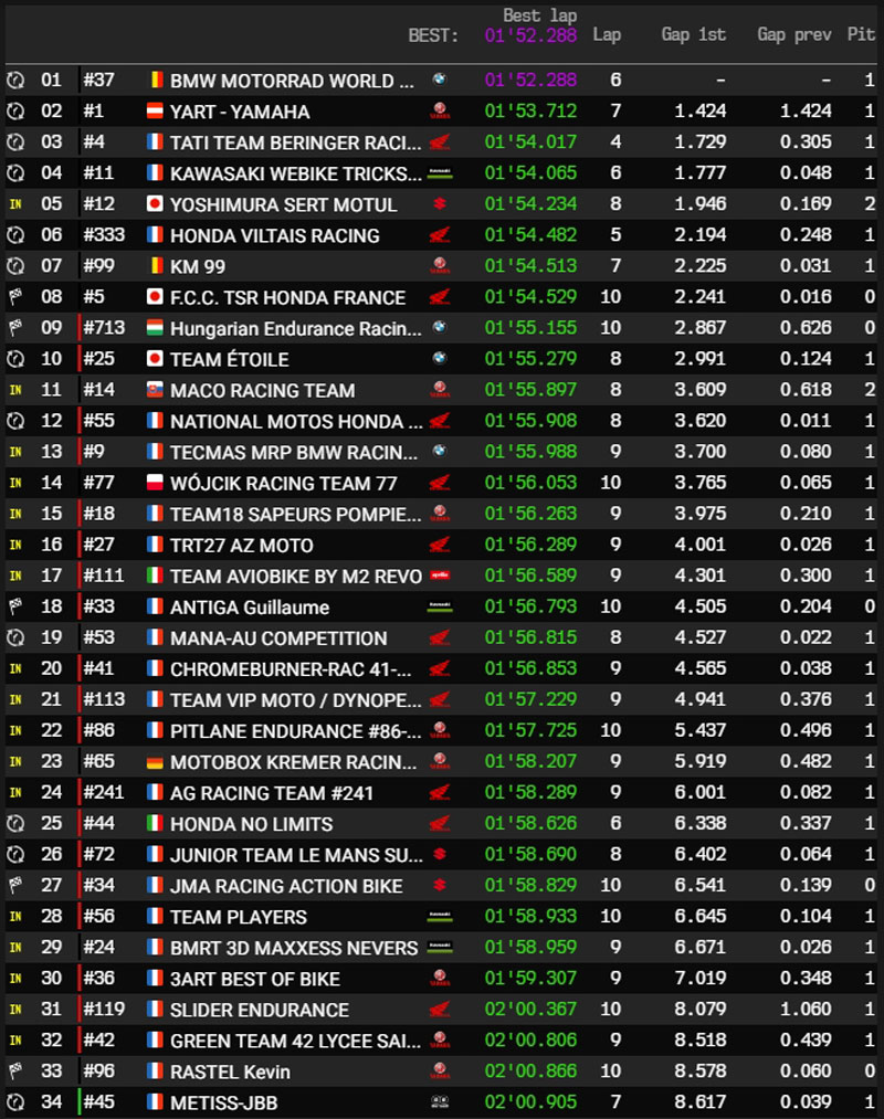 Le BMW Motorrad World Endurance Team a de nouveau réalisé une belle performance lors de la séance des pilotes jaunes, Markus Reiterberger s’imposant avec un meilleur effort de 1’52.288s. Marvin Fritz a été le deuxième plus rapide pour l’équipe Yamalube YART Yamaha EWC Official Team, à 1,424 seconde de son collègue allemand, tandis que Hugo Clère a été le troisième plus rapide pour l’équipe Tati Team Beringer Racing. Román Ramos (Kawasaki Webike Trickstar) a réalisé le quatrième temps tandis qu’Etienne Masson a réalisé le cinquième temps pour Yoshimura SERT Motul, une place devant Steven Odendaal de Honda Viltaïs Racing. Randy de Puniet (KM99) et Mike Di Meglio (F.C.C. TSR Honda France) étaient respectivement septième et huitième, suivis par Máté Számadó du Hungarian Endurance Racing Team, qui a battu Yudai Kamei du Team Étoile en réalisant le meilleur temps de la catégorie Superstock Dunlop au guidon d’une BMW 1-2. Christoffer Bergman, du Maco Racing Team, a pris le relais, suivi de Valentin Suchet, de National Motos Honda FMA. Adrien Lapine, le nouveau venu d’Uniserv Moto82, a chuté au virage 5 mais a pu poursuivre sa route.