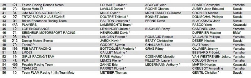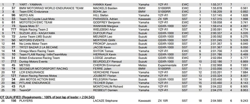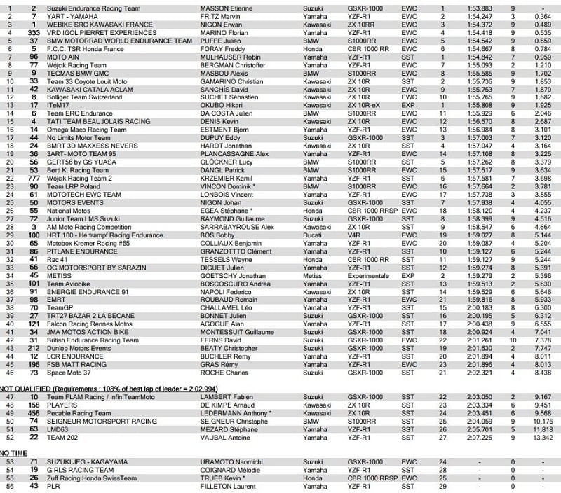 A l’issue des qualifications, le YART avec Loris Baz, Marvin Fritz et Niccolò Canepa, a devancé Webike SRC Kawasaki France avec Jérémy Guarnoni, Erwan Nigon et David Checa, suivi par le team japonais F.C.C. TSR Honda France avec Josh Hook, Freddy Foray et Mike di Meglio, le BMW Motorrad World Endurance Team avec Ilya Mikhalchik, Julian Puffe et Kenny Foray, le Team ERC Endurance avec Mathieu Gines, Julien da Costa et Louis Rossi sur BMW, le Suzuki Endurance Racing Team avec Vincent Philippe, Etienne Masson et Gregg Black, et le Tati Team Beaujolais Racing avec Alan Techer, Kevin Denis et Julien Enjolras.