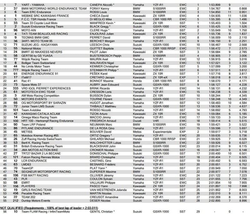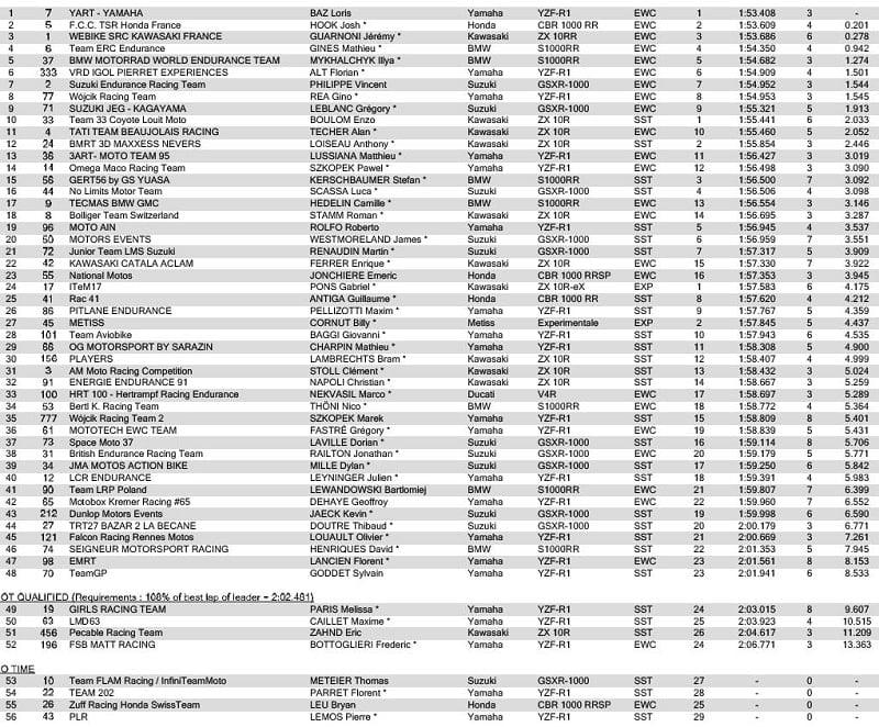 Loris Baz a établi un nouveau record du tour en 1’53.408. « J’aime courir en Endurance, a déclaré Loris Baz, mais il n’est pas toujours facile de concilier les calendriers de Mondial Superbike et d’Endurance. Je remercie mon équipe Ten Kate de m’avoir laissé rouler ici pour remplacer Broc Parkes et je suis ravi de retrouver l’équipe de Mandy Kainz avec qui je suis resté en relation depuis notre première rencontre en 2011. » Le YART enregistre ainsi les premiers points distribués en Championnat du Monde FIM EWC 2019-2020. L’équipe de Mandy Kainz reçoit les 5 points bonus de la pole position.