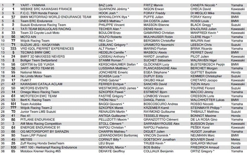 A l’issue des qualifications, le YART avec Loris Baz, Marvin Fritz et Niccolò Canepa, a devancé Webike SRC Kawasaki France avec Jérémy Guarnoni, Erwan Nigon et David Checa, suivi par le team japonais F.C.C. TSR Honda France avec Josh Hook, Freddy Foray et Mike di Meglio, le BMW Motorrad World Endurance Team avec Ilya Mikhalchik, Julian Puffe et Kenny Foray, le Team ERC Endurance avec Mathieu Gines, Julien da Costa et Louis Rossi sur BMW, le Suzuki Endurance Racing Team avec Vincent Philippe, Etienne Masson et Gregg Black, et le Tati Team Beaujolais Racing avec Alan Techer, Kevin Denis et Julien Enjolras.