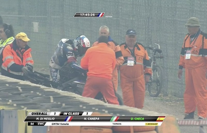 Annoncé sur les ondes tout d’abord au Garage vert, David Checa vient en fait de tomber entre le Chemin aux bœufs et le virage des « S » bleus . Le pilote n’est heureusement pas blessé, mais la R1 est abîmée.