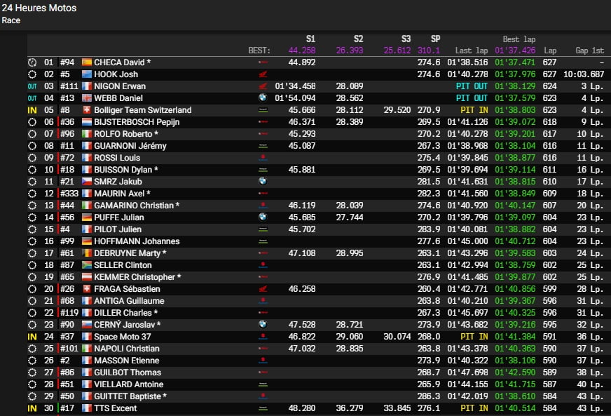 La R1 possédait 5 tours d’avance sur la Honda FCC TSR Honda France, qui ne devrait pas tarder à prendre logiquement la tête.
