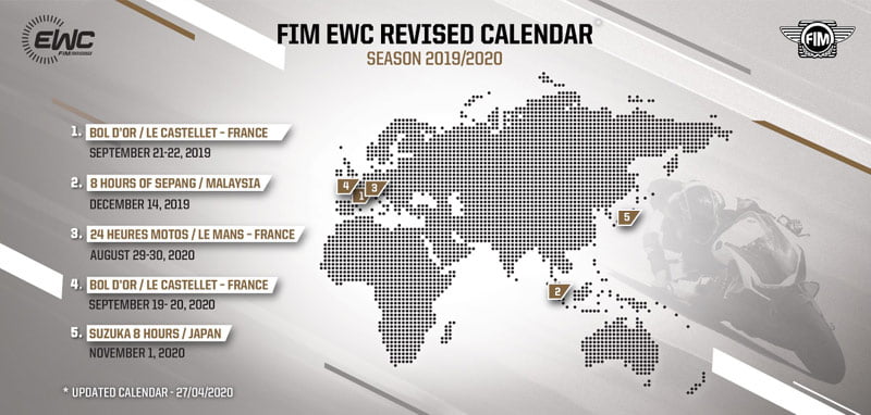 Le cours de la saison 2019-2020 reprendra avec les 24 Heures Motos (29 et 30 août 2020), suivi du Bol d’Or (19 et 20 septembre) pour se clôturer par la grande finale FIM EWC à Suzuka.