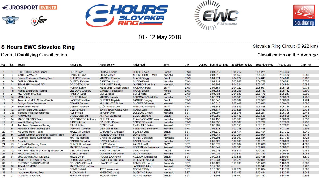 L’équipe japonaise F.C.C. TSR Honda France partira en pole position demain des 8 Hours of Slovakia Ring devant le YART Yamaha et le Suzuki Endurance Racing Team.