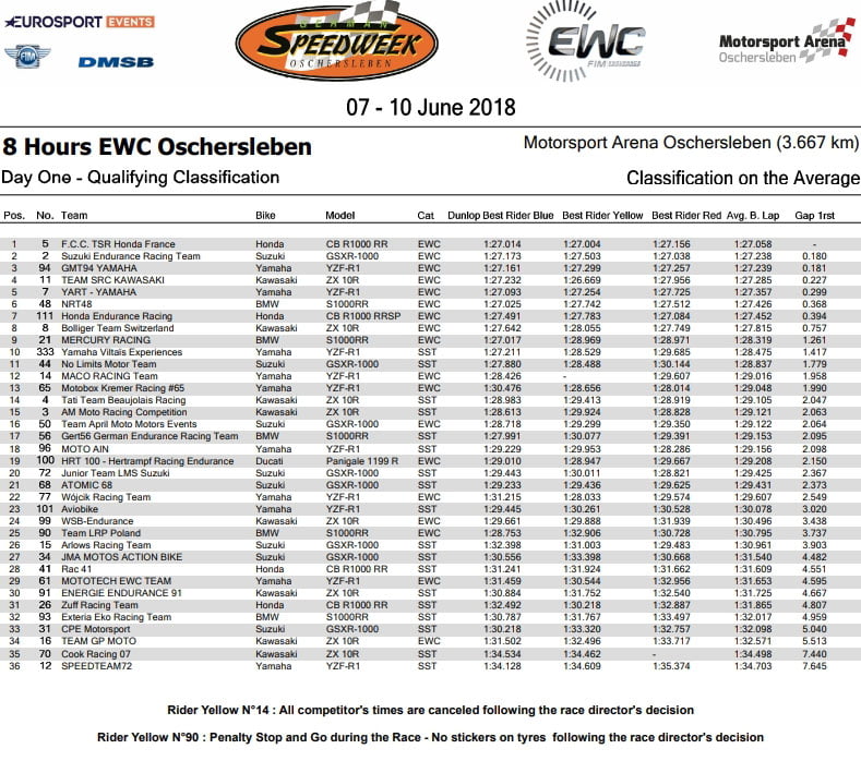 En tête du classement provisoire du Championnat du monde FIM EWC 2017-2018, le F.C.C. TSR Honda France a décidé de frapper fort d’entrée pour cette 4e manche en Allemagne. Avec une moyenne de leurs meilleurs temps en 1’27.058, Freddy Foray, Josh Hook et Alan Techer placent la Honda #5 en tête de la première séance de qualification des 8 Hours of Oschersleben. Cette performance est de bon augure pour cette équipe japonaise qui doit défendre sa place de leader à un point seulement du GMT94 Yamaha.