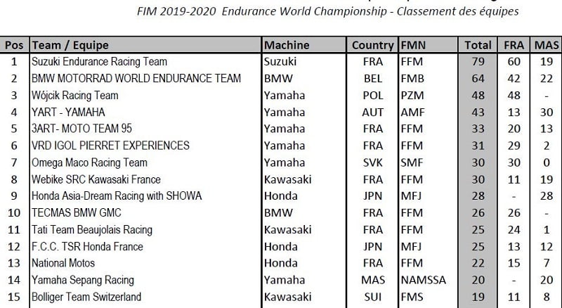 Après les récentes annulations du Bol d’Or et des 8 Heures de Suzuka, l’avant-dernière course du Championnat du Monde d’endurance aura lieu les 29 et 30 août au Mans, puis la finale sera constituée par les 12 Heures d’Estoril le 27 septembre au Portugal. Au Championnat du Monde, le Suzuki Endurance Racing Team mène la danse avec 79 points, devant l’équipe officielle allemande BMW Motorrad World Endurance Team avec 64 points, le team privé polonais Wójcik Racing Team sur Yamaha avec 48 et le YART (Yamaha Austria Racing Team) avec 43.