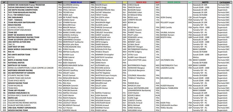 La liste des équipages engagés aux 24 Heures Motos 2020 comprend désormais 43 machines : 18 dans la catégorie Formula EWC, 24 en catégorie Superstock et une moto engagée dans la catégorie Expérimental.