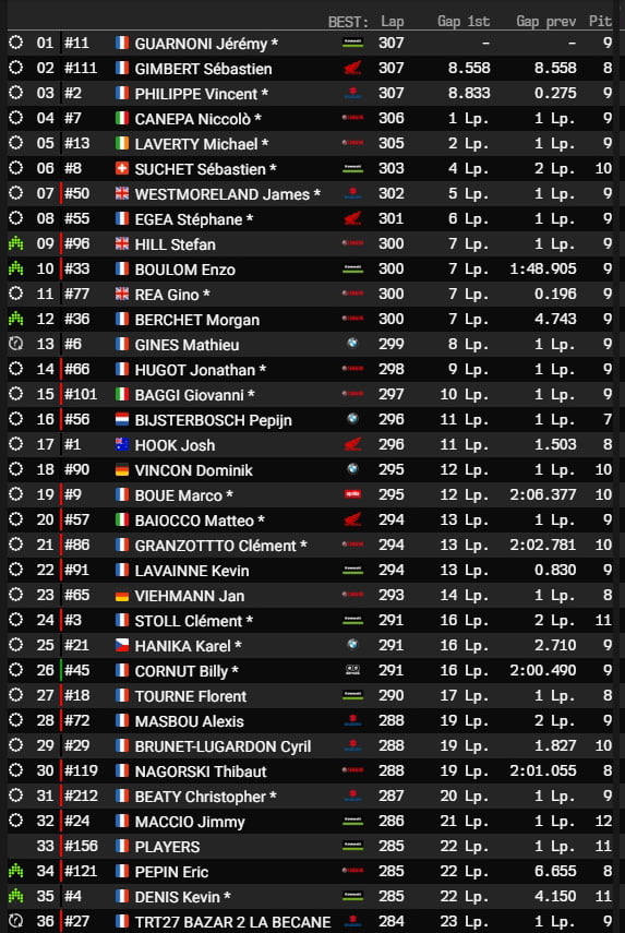 En tête, la Kawasaki #11 possède alors 1 minute d’avance sur la Suzuki #2, et un tour sur le groupe BMW #6 / Yamaha #13 / Honda #111 et Yamaha #7 qui a fait un tout droit au virage du Musée.
