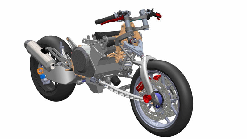 Réalisée autour d’un moteur porteur Suzuki, et d’une partie cycle composée d’éléments démontables sans fourche traditionnelle, elle a bien sûr évolué au fil des 15 saisons passées en endurance, d’autant que la petite équipe de bénévoles conçoit et réalise pratiquement tous les éléments dans leur atelier de Vibraye dans la Sarthe : châssis, réservoirs, radiateurs, carénages et selles. Ces pièces de châssis dessinées et fabriquées en interne sont quasiment toutes taillées dans la masse, en aluminium, y compris les roues avant.