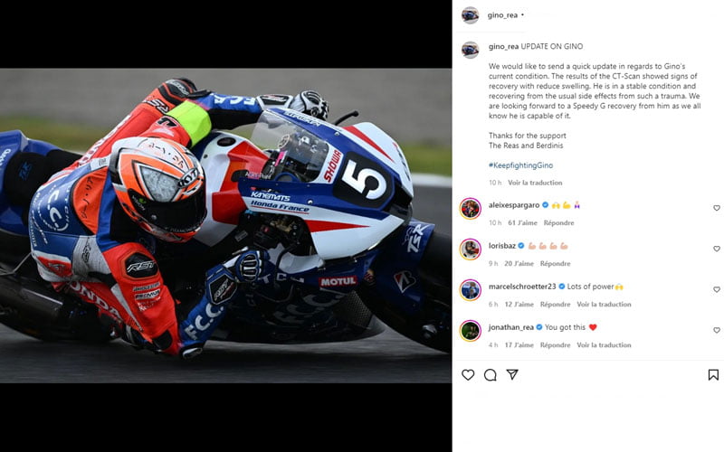 A défaut de communication officielle, c’est une nouvelle fois la famille, qui s’est rendue au Japon, qui nous en informe sur le compte Instagram du pilote britannique, faisant état de progrès et de signes encourageants concernant l’état de santé du pilote de la FCC TSR Honda France au sujet duquel les médecins réservaient leur pronostic lors des premières 48 heures.