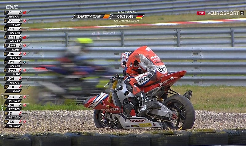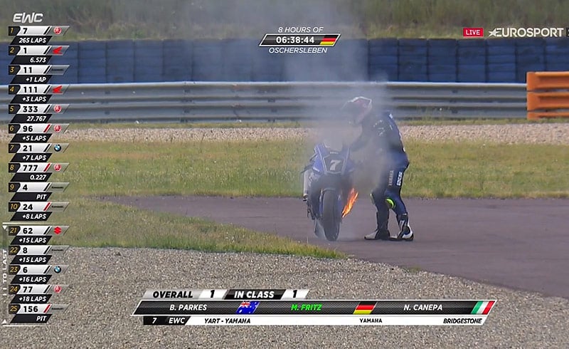A 18h40, la Yamaha #7 pilotée par Marvin Fritz qui menait les 8 Heures d’Oschersleben a connu un début d’incendie (sans doute dû à de l’huile sur les échappements) et a été contrainte à l’abandon.