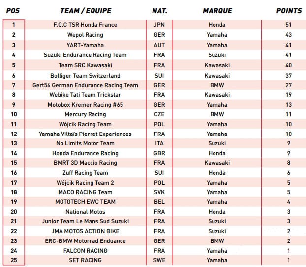L’équipe japonaise TSR associée à Honda France, championne du monde en titre, arrivera au Mans en tête du classement provisoire après sa victoire au Castellet. Mais la concurrence est de plus en plus vive chaque saison avec un engagement plus important des constructeurs et des teams permanents. Plus de 40 équipes sous contrat représentant 13 nations et 5 constructeurs seront au départ des 24 Heures Motos le 20 avril prochain.