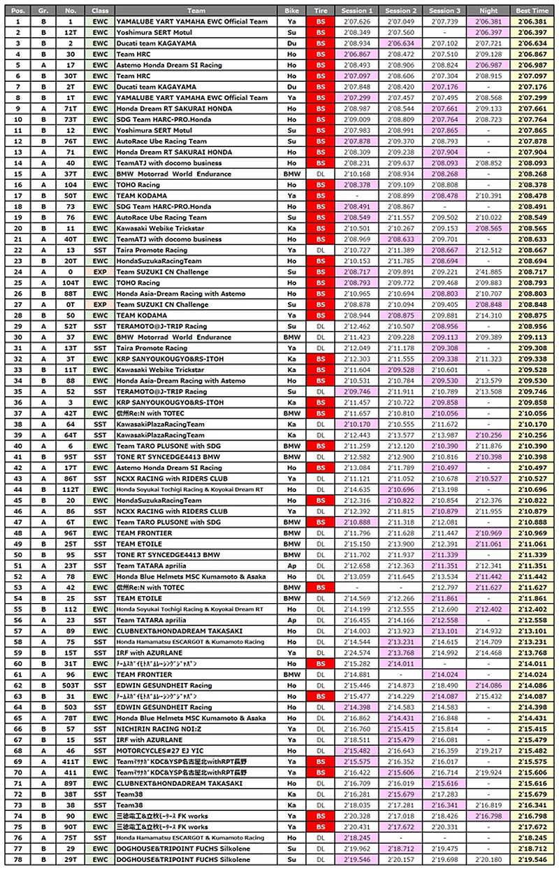 Enfin, lors de la session de 70 minutes « de nuit », le Yamalube YART-Yamaha EWC Official Team (Yamaha YZF-R1 – Niccolò Canepa/Marvin Fritz/Karel Hanika) a profité des minutes de jour (seules les 20 dernières minutes se sont déroulées dans la pénombre) pour abattre un 2’06.381, le temps de référence de la journée, 16 millièmes de seconde devant le Yoshimura SERT Motul (Suzuki GSX-R 1000 – Gregg Black /Dan Linfoot/Cocoro Atsumi).