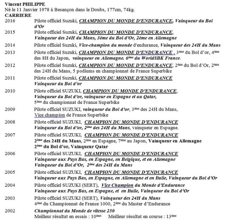 Dix fois Champion du Monde d’endurance, toujours avec le SERT, Vincent Philippe en est arrivé à un tournant de sa carrière. Dans une entrevue qu’il nous avait aimablement accordé, son point de vue était sans équivoque « Il faut profiter de ce changement au niveau de la Direction du SERT pour évoluer vers le modernisme, le dynamisme. » Vincent, es-tu satisfait de la nouvelle organisation ?
