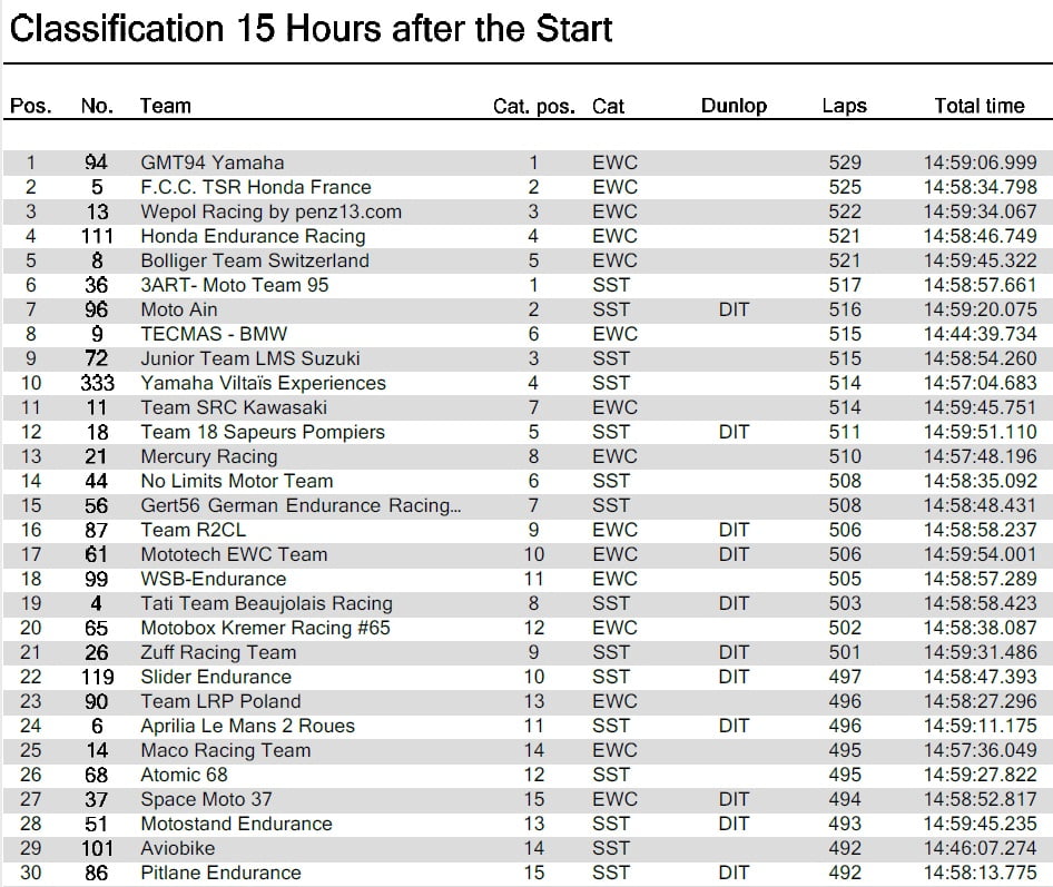La 14e heure était marquée par l’annonce du 11e abandon officiel, la Kawasaki #33 de Team 33 Accessoires – Louit Moto qui étaient engagée en catégorie Superstock.