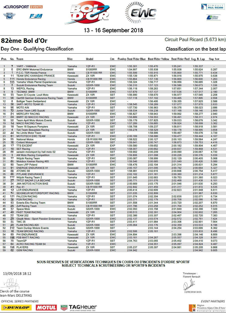 Bol d’Or – Résultats des qualifications Jour 1