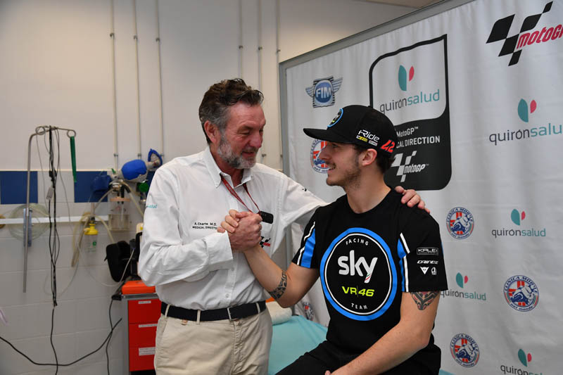 Les examens médicaux sont supervisés par le directeur médical du MotoGP™ Angel Charte, nommé l’un des meilleurs médecins d’Espagne, qui dirige le Département de Médecine Interne de l’Hôpital Universitaire Dexeus – Grupo Quirónsalud de Barcelone. Michele Zasa, directeur médical de la Clinica Mobile, également parrainée par Quirónsalud, forment l’équipe qui effectue les examens, lesquels consistent en des tests décrits à l’Annexe B du Règlement des Grands Prix du Championnat du Monde de Course sur Route de la FIM. Les pilotes ont aussi subi un électrocardiogramme. En outre, chaque coureur signe l’Annexe B, détaillant ses antécédents médicaux, et le formulaire de consentement antidopage du pilote.