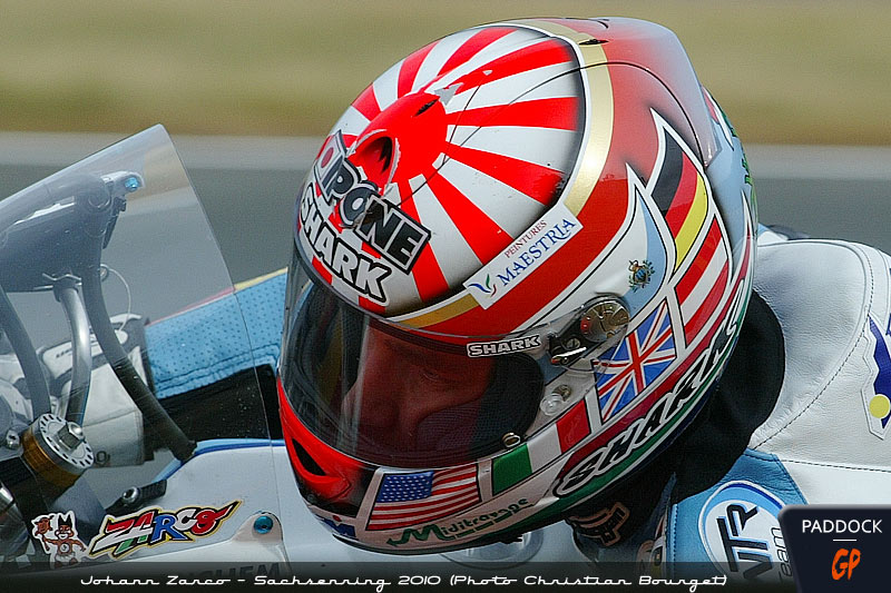 Johann Zarco: « La décoration du casque, ça avait commencé avec ce soleil levant, ce joli soleil qui représente les pilotes japonais de l’ère des années 90, quand Laurent travaillait sur les Grands Prix, quand Ueda, Sakata, Wakai et beaucoup de Japonais sont arrivés et ont fait des performances incroyables. C’était un clin d’œil à ces Japonais et cet esprit japonais qui était alors « Je fonce ». Puis, on s’est également rendu compte que ça se voyait très bien à la télé, donc on s’est dit « pourquoi pas le garder? ».