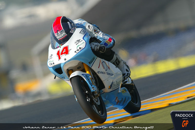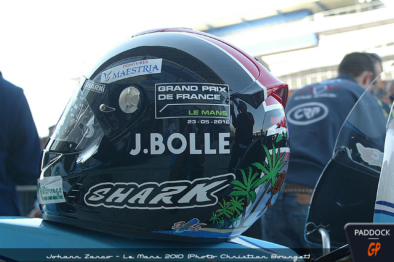 Et puis l’arrière de mon casque, au début il y avait un « Tchin Tchin »; c’était comme une représentation du Fan Club. Puis, c’était un » Tchin Tchin » en couches-culottes. Lorsque j’ai eu un podium, on a enlevé la couche-culotte et » Tchin Tchin » est devenu adulte . Et maintenant qu’on a vraiment cette association ZF Grand Prix, j’ai souhaité mettre une photo de Laurent et moi, pour bien annoncer aux gens que l’aventure, c’est à deux, « Tu prends Zarco, tu prends Fellon » car c’est à deux que nous fonctionnons; lui a les idées, moi je fonce, et on avance très bien ainsi. »
