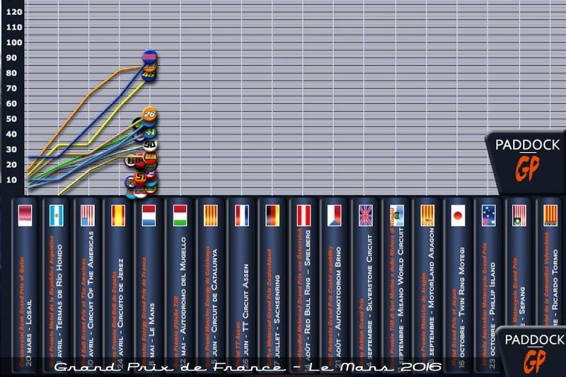 En un seul coup de d’œil, vous pouvez y apprécier la situation, ainsi que là où chaque pilote (du moins ceux du Top 10, pour le moment) ont marqué le pas, course par course.
