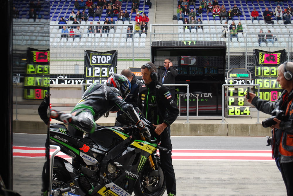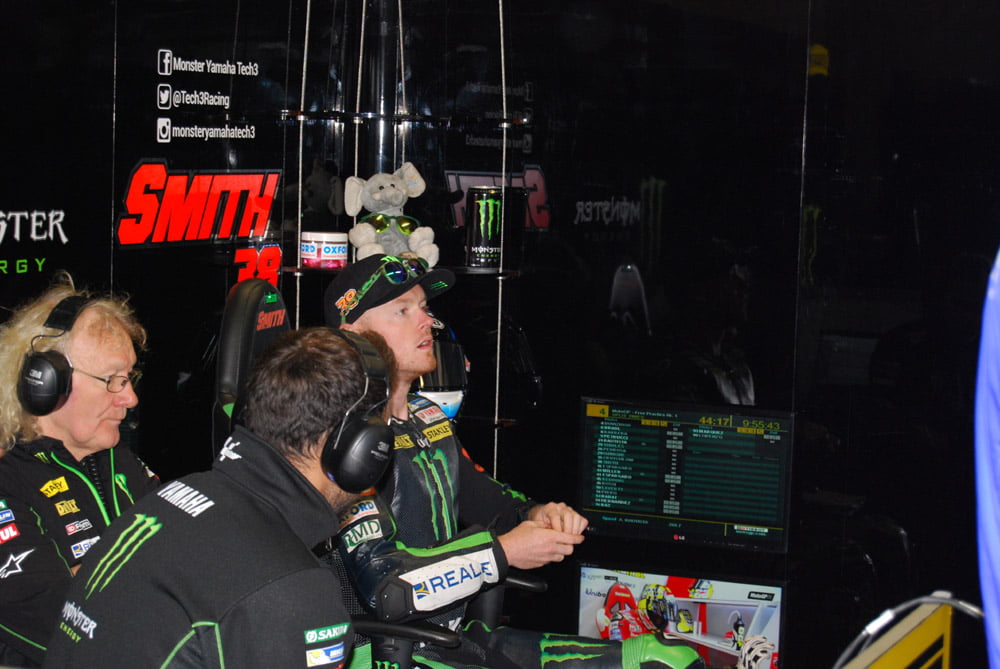 Nous voilà reparti, boostés comme jamais, pour cette deuxième journée. Nous avons pu assister aux FP1 motoGP depuis le Box TECH3. L’ambiance y est beaucoup plus studieuse que la veille, chacun concentré sur sa tâche. Quelques réglages sur les motos, dernier briefing aux pilotes et voilà que Pol et Bradley s’élancent pour la première session d’essais libres.