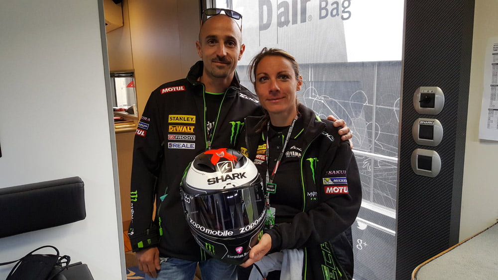 Le programme de l’après-midi nous fait une fois de plus prendre conscience ce que les inscriptions VIP de nos badges signifient. Emeline, de l’Hospitality, nous a conduit chez les équipementiers de casques. Nous y avons rencontré Michaël Rivoire (SHOEI) et Jean-Jacques Lacroix (SHARK). Tous deux nous ont fait partager les exigences de certains pilotes, les différentes configurations de casque et la pose de tear-off. Cerise sur le gâteau, nous avons eu la permission de prendre en main le casque de Jorge Lorenzo tout fraîchement sorti des essais libres et non séché de sa sueur…