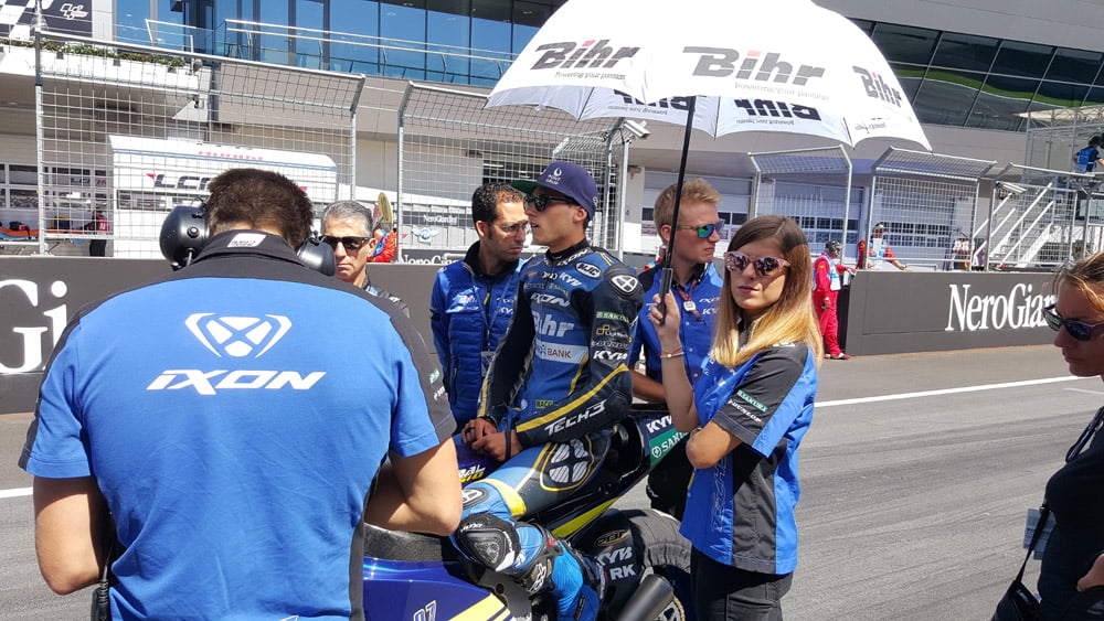 Peu de temps avant la course Moto2, nouveau rebondissement. Mathilde Poncharal, la fille d’Hervé, nous propose un accès sur la grille de départ avant le départ de cette catégorie. On n’en revenait tout simplement pas. Nous allions fouler la grille de départ. Le tour de formation lancé, nous voilà en train de rejoindre avec Mathilde l’emplacement de la Mistral de Xavi Vierge.