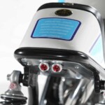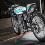 « D’un commun accord avec Bernard, je suis parti dans l’esthétique et l’esprit racing des années ’70, un hommage à la célèbre lignée TZ de chez Yamaha et tout à fait fidèle à la carrière de Bernard. Nous avons gardé des teintes bleues (les couleurs de Bernard). Afin de compliquer un peu le petit monocylindre, je lui ai ajouté un compresseur Aisin 300 qui lui donne un caractère plus trempé. »